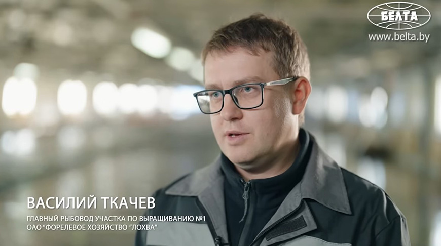 Филиал в Косичах имеет два модуля, в каждом по два бассейна. На этот участок поступает посадочный материал от семи граммов. Потом рыбу распределяют по другим участкам. "Один бассейн порядка 1200 кубов. Посадочное место порядка 350 кубов. На куб содержится примерно 350 кг форели. Кормление осуществляется автоматически. Питание происходит благодаря артезианским скважинам, их всего шесть. Но задействованы где-то две", - рассказал главный рыбовод участка по выращиванию №1 Василий Ткачев.