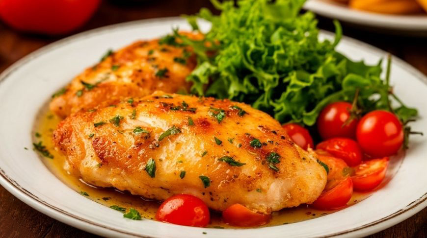 С грудки срезают лишний жир и пленки. Если куски крупные, то их слегка отбивают молотком для равномерной толщины и быстрой прожарки. Солят и перчат с обеих сторон. В разогретом оливковом масле обжаривают 3-5 минут с каждой стороны до золотистой корочки, затем убирают на тарелку.