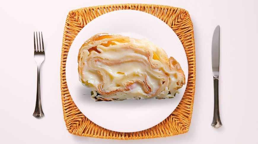 Готовый корж аккуратно снимите с бумаги и переложите на чистое полотенце или бумагу. Равномерно распределите заварной крем по поверхности коржа, оставляя небольшой отступ от краев. Аккуратно сверните рулет с помощью полотенца или бумаги, чтобы он получился плотным и ровным. Заверните рулет в пищевую пленку и поставьте в холодильник минимум на два-три часа, а лучше на ночь.