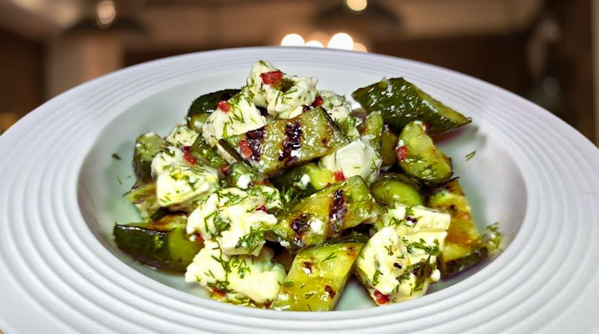 Немного остывшие огурцы нарезаем на крупные кусочки и перекладываем в глубокую тарелку. Добавляем сыр сиртаки, предварительно измельчив его до такого состояния, чтобы кусочки сыра были примерно того же размера, что и огурцы.