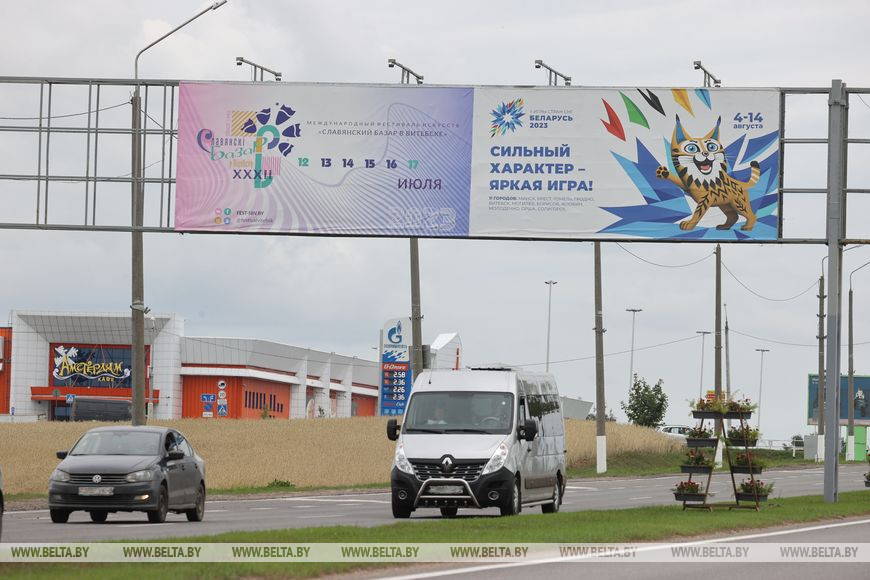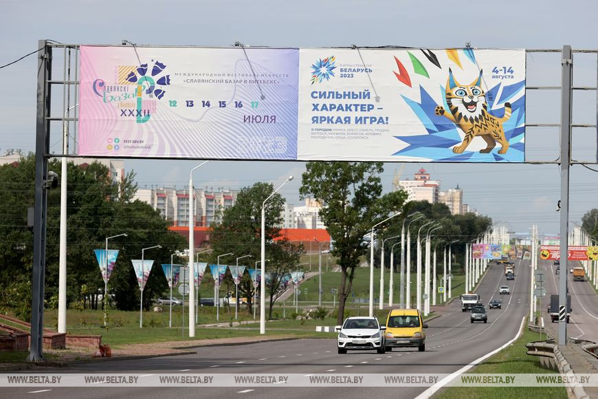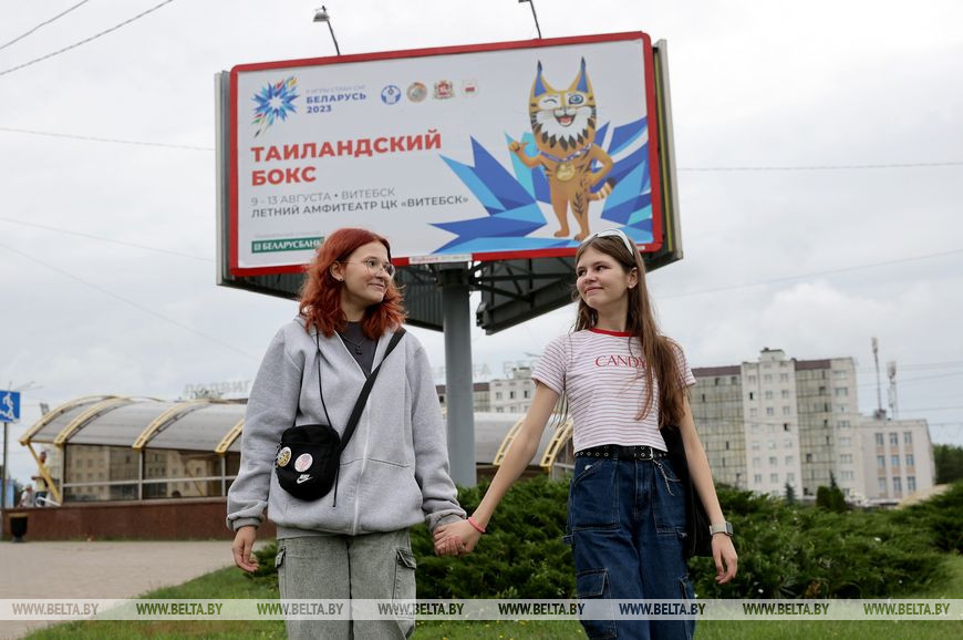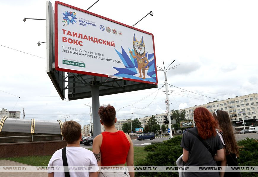 27 июля, Витебск /Корр. БЕЛТА/. Тематическими баннерами украсили Витебск в преддверии II Игр стран СНГ, в Летнем амфитеатре с 9 по 13 августа пройдут соревнования по таиландскому боксу.-0-