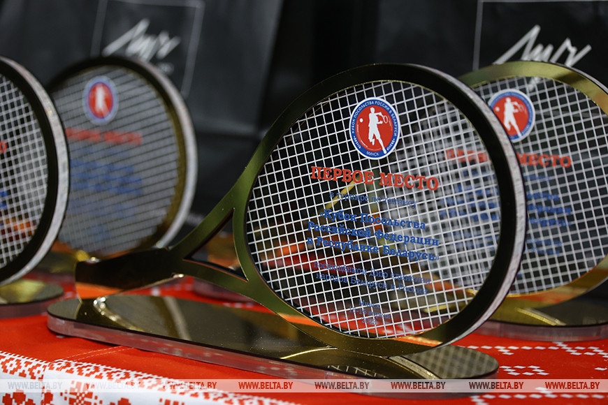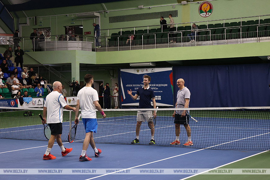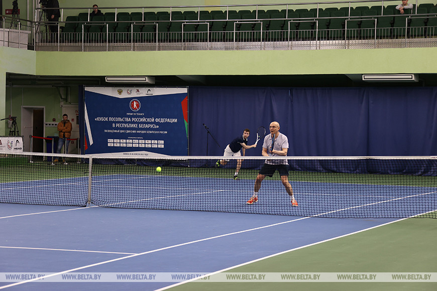 16 апреля, Минск /Корр. БЕЛТА/. В Минске завершился теннисный турнир на Кубок посольства Российской Федерации в Беларуси, посвященный Дню единения народов Беларуси и России. В турнире в минском Дворце тенниса приняли участие 16 пар - по 8 белорусских и российских.