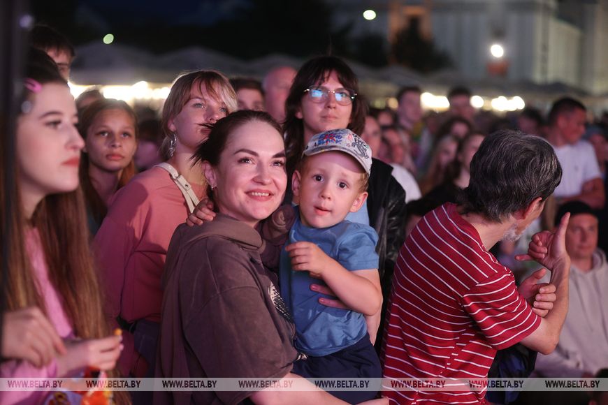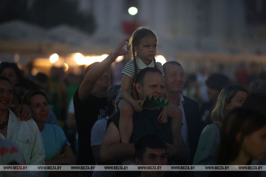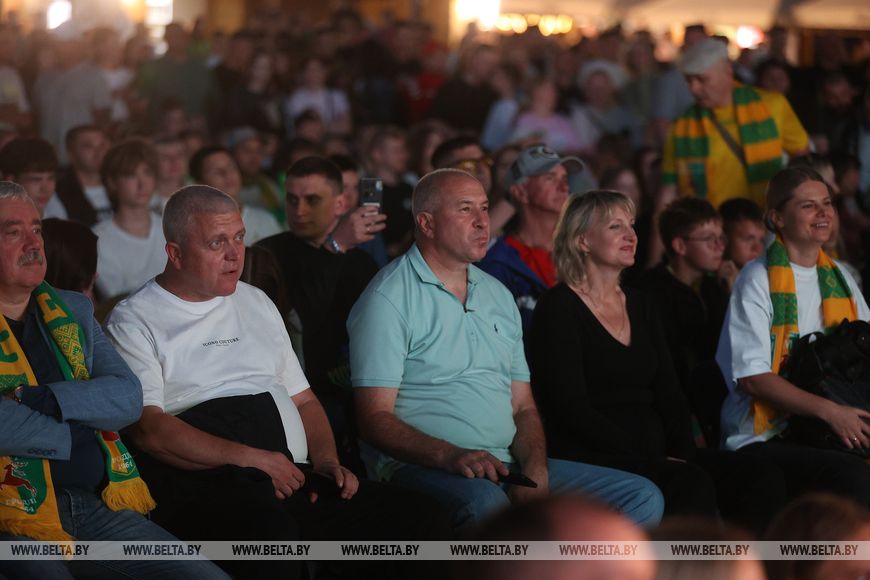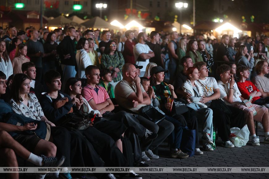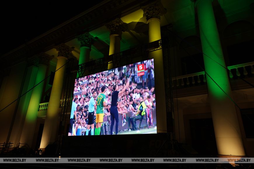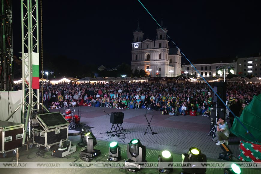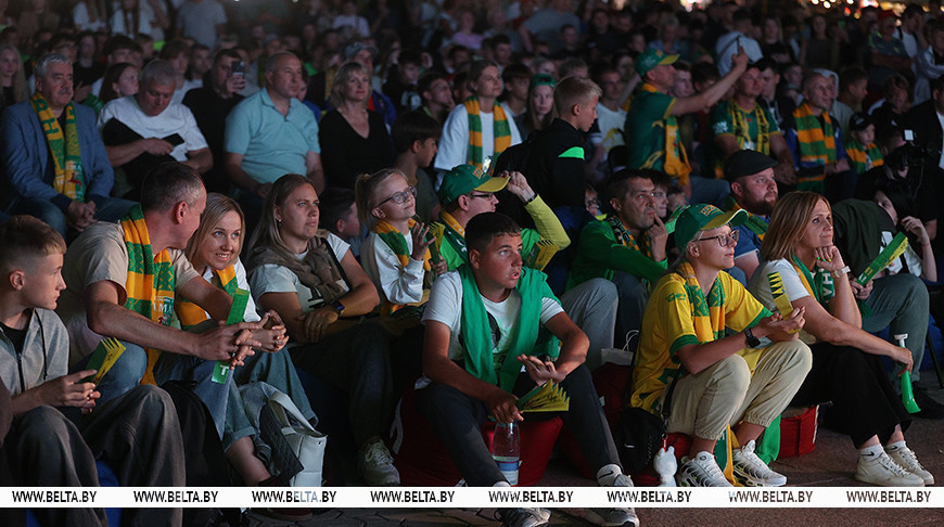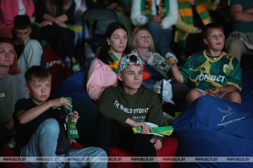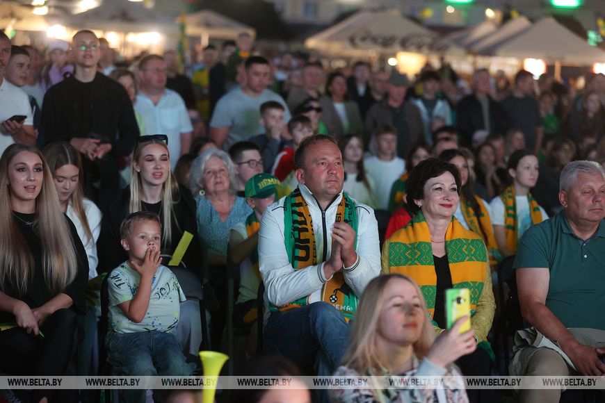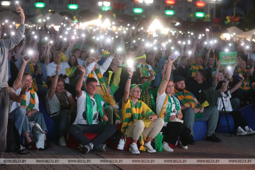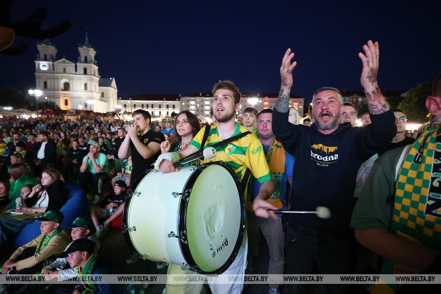 28 августа, Гродно /Корр. БЕЛТА/. В центре Гродно тысячи горожан и гостей города вместе смотрят второй матч плей-офф квалификации Лиги конференций УЕФА, в котором "Неман" встречается с испанским "Райо Вальекано".-0-