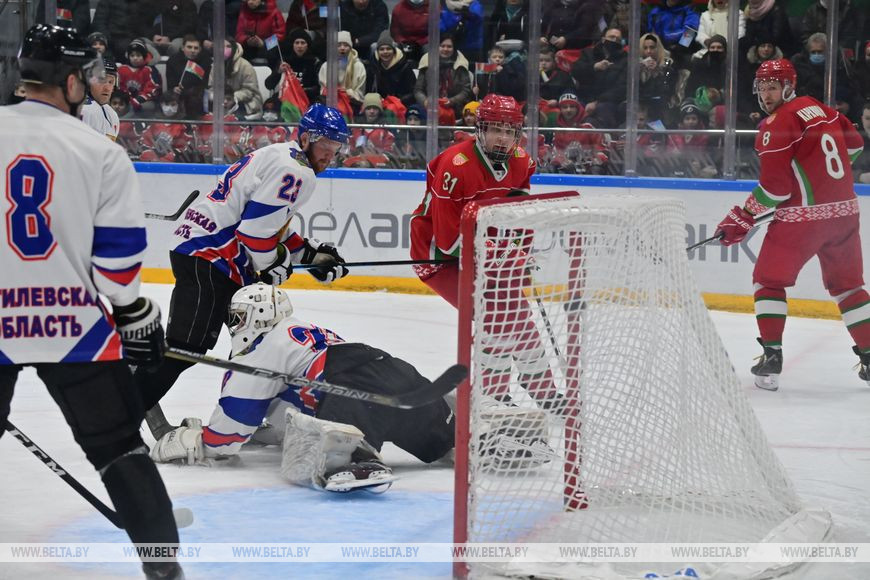 Сегодня на льду столичной "Олимпик-Арены" президентская дружина обыграла хоккеистов Могилевской области со счетом 12:4 (4:0, 4:3, 4:1). Долгое время соперникам не удавалось открыть счет, но в середине первого периода в течение четырех минут хозяева четыре раза подряд поразили ворота могилевчан.