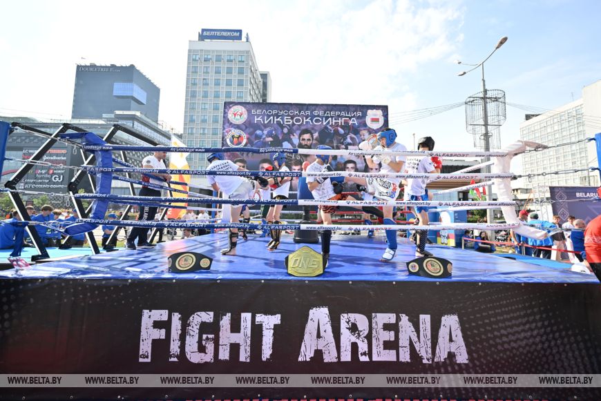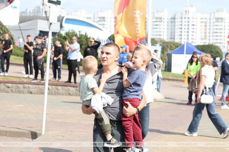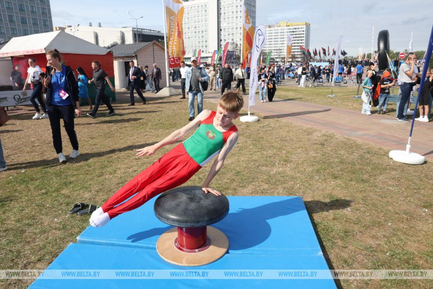 Известные белорусские спортсмены проводят мастер-классы в Минске. Всего на площадке у Дворца спорта развернулось более 30 спортивных зон для ребят в возрасте до 14 лет.