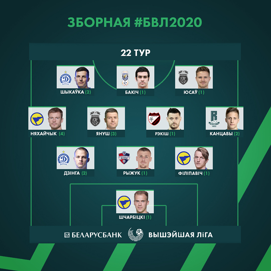Кроме борисовчан в символическую сборную 22-го тура включены Николай Януш, Дмитрий Юсов (оба - "Ислочь", Минский район), минские динамовцы Доминик Динга и Евгений Шикавка, Дмитрий Рыжук ("Минск"), Дмитрий Рекиш ("Белшина", Бобруйск), Артем Концевой ("Рух", Брест) и Душан Бакич ("Энергетик-БГУ", Минск).