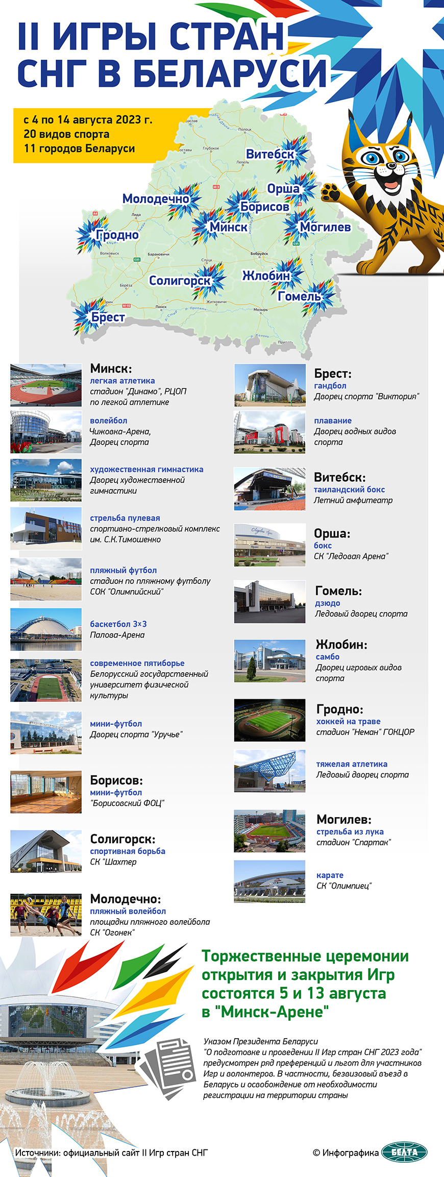 II Игры стран СНГ проходят в Беларуси с 4 по 14 августа по 20 видам спорта. В них принимают участие более 2,2 тыс. атлетов, представляющих более 20 государств. Торжественные церемонии открытия (5 августа) и закрытия (13 августа) пройдут в "Минск-Арене".-0-