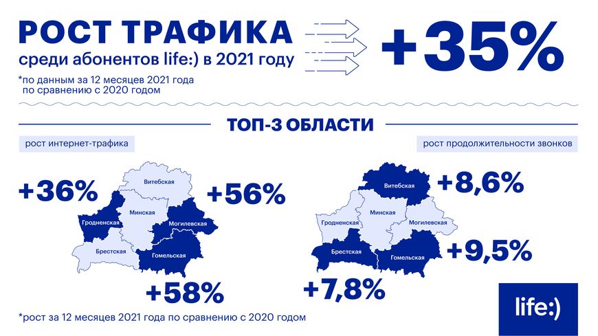 Несмотря на то, что абоненты life:) активно пользуются мобильным интернетом и решают множество вопросов онлайн, они продолжают много общаться и по мобильной сети. Рост голосового трафика в этом году зафиксировали по всей стране. Так, в Витебской области общаться по телефону стали на 8,6 % больше, а в Брестской области – на 7,8 %. В Гомельской области количество разговоров увеличилось на 9,5 %, в Гродненской – на 2,7 %.
