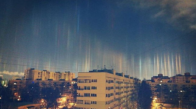 "Вертикальное северное сияние" - так назвали увиденное очевидцы. На самом деле данное погодное явление чаще называют "световой лес". Оно возникает при отрицательных температурах, когда свет не рассеивается в воздухе, а отражается на горизонтальных гранях ледяных кристаллов.