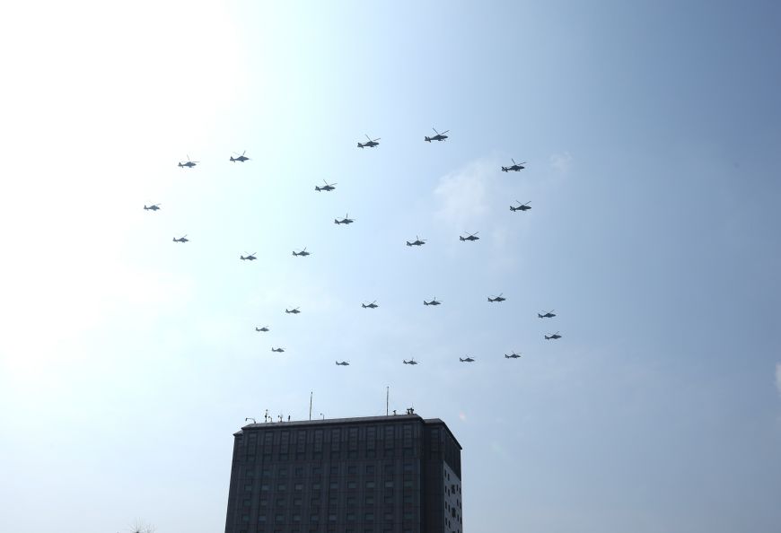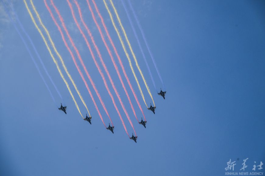 На параде показали новейшую китайскую авиацию - ракетоносцы, вертолеты, истребители и транспортники. Воздушные знаменосцы пронесли над столицей государственный флаг КНР и флаг НОАК. Вертолеты изобразили в небе цифру 80. В завершение парада в небо выпустили 80 тыс. голубей, символизирующих мир.-0-