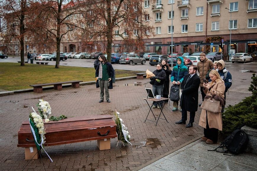 Около двух десятков молодых людей начали акцию протеста на площади Независимости в Вильнюсе, поставив гроб у здания парламента. Молодежь несет к гробу венки, на нем стоит изображение с надписью "Государство, которое действует". Отмечается, что акция будет проходить до вечера, в течение дня к ней должно присоединиться больше представителей местной молодежи.