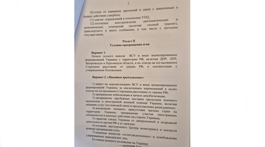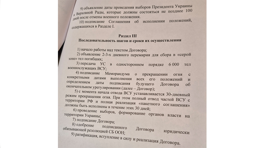 Мирный договор между Россией и Украиной должен быть одобрен юридически обязывающей резолюцией СБ ООН. Предполагается отказ от взаимных претензий с Украиной в связи с ущербом от боевых действий. Кроме того, меморандум РФ подразумевает снятие всех действующих в отношении России санкций и отказ от новых.В третьем разделе документа, устанавливающем последовательность шагов и сроки их осуществления, сразу после передачи Россией украинской стороне 6 тыс. тел погибших военных следует "подписание меморандума о прекращении огня с конкретными датами выполнения всех его положений и определением даты подписания будущего договора об окончательном урегулировании". Затем устанавливается 30-дневный режим прекращения огня. Далее идет "проведение выборов, формирование органов власти на территории Украины", а за ним следует "подписание договора".-0-