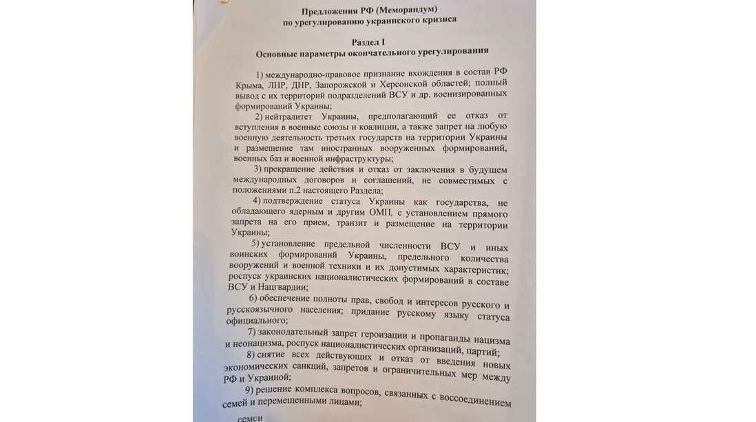 Среди основных положений - международно-правовое признание вхождения Крыма, ЛНР, ДНР, Запорожской и Херсонской областей в состав России. Предложения РФ предполагают провозглашение нейтралитета Украины, ее отказ от вступления в военные союзы. В меморандуме также говорится о необходимости установления предельной численности ВСУ и безъядерного статуса Украины.