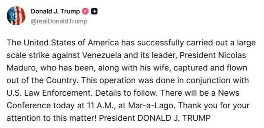 Сегодня Трамп намерен дать специальную пресс-конференцию об операции в Венесуэле, ожидается, что она пройдет в 19.00 по минскому времени.-0-