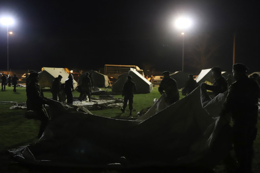 Местные власти призвали людей оставаться вне своих домов, пока те не будут проверены. Военные установили палатки и пункты выдачи еды на футбольном поле.-0-