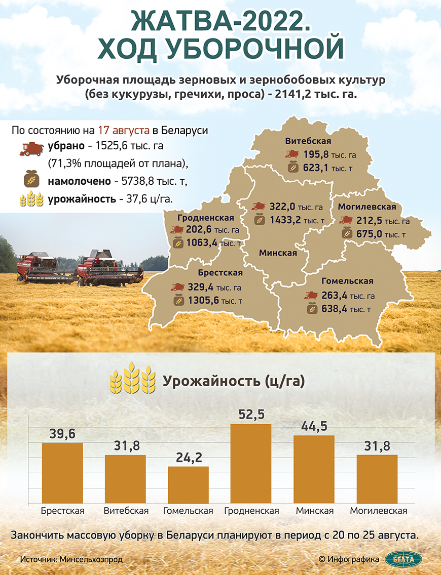 По данным оперативной информации, на утро 17 августа в целом по стране зерновые и зернобобовые культуры (без кукурузы, гречихи и проса) убраны с 1,525 млн га, что составляет 71,3% от плана. В Брестской области убрано 95,2% площадей (329,4 тыс. га), Витебской - 54,1% (195,8 тыс. га), Гомельской - 75,9% (263,4 тыс. га), Гродненской - 66,4% (202,6 тыс. га), Минской - 71,7% (322 тыс. га), Могилевской - 63,9% (212,5 тыс. га).