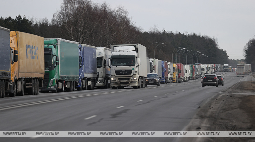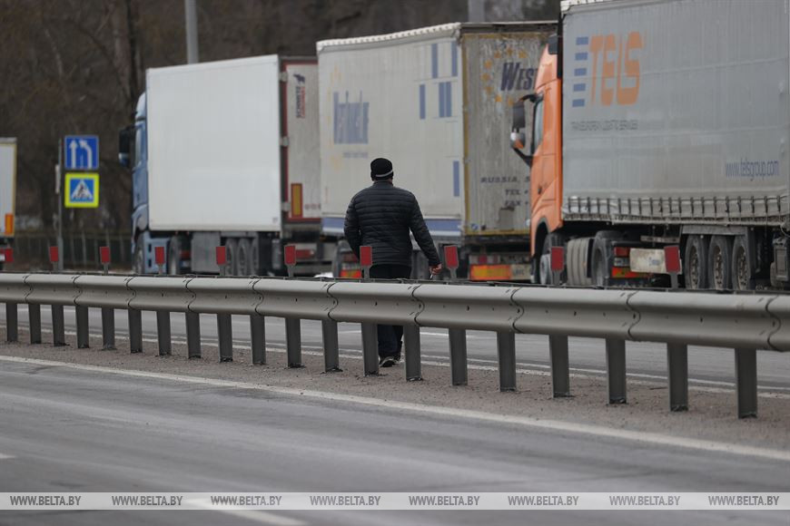 23 января, Брестская область /Корр. БЕЛТА/. Очередь из грузовых автомобилей выстроилась перед пунктом пропуска "Козловичи". Более 600 грузовиков ожидают своей очереди на выезд из Беларуси. Длина очереди составляет более 15 км. -0-