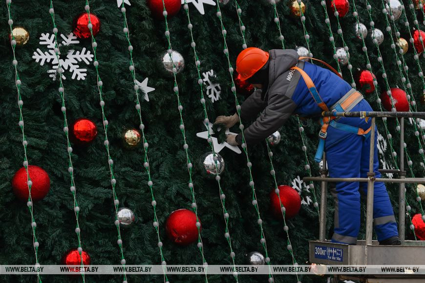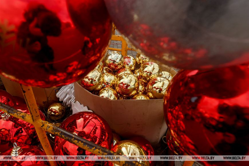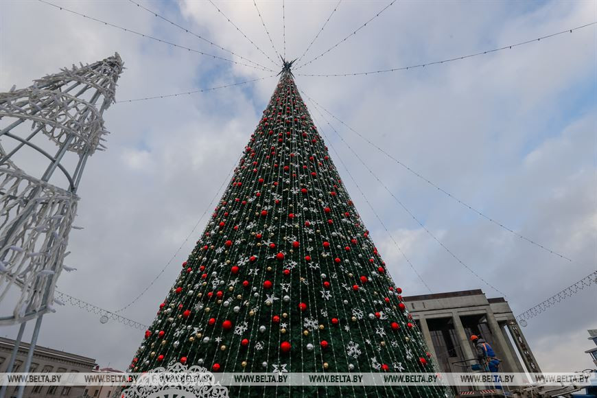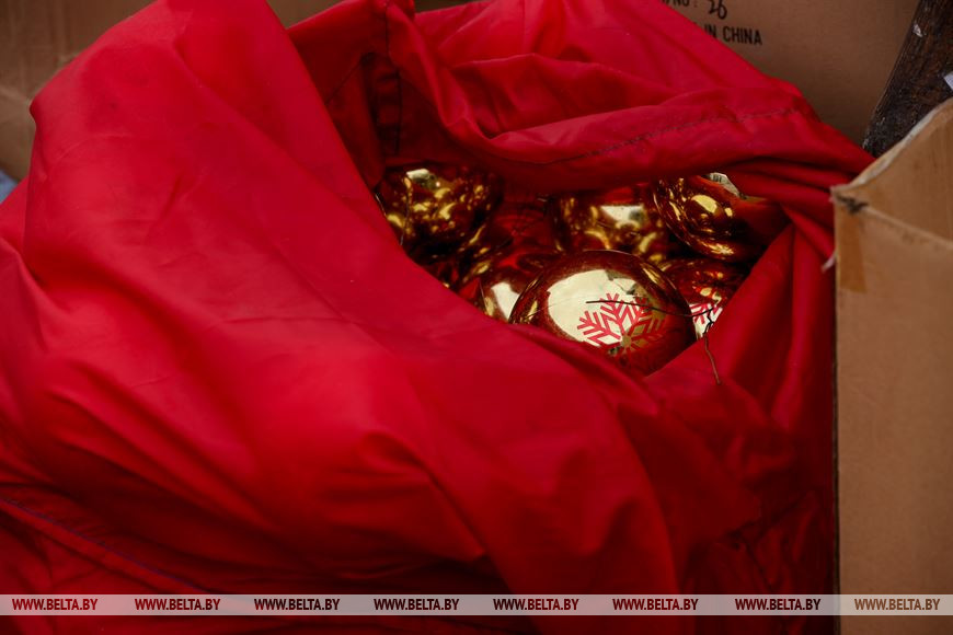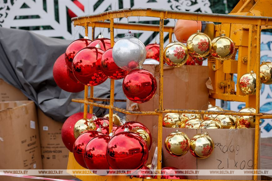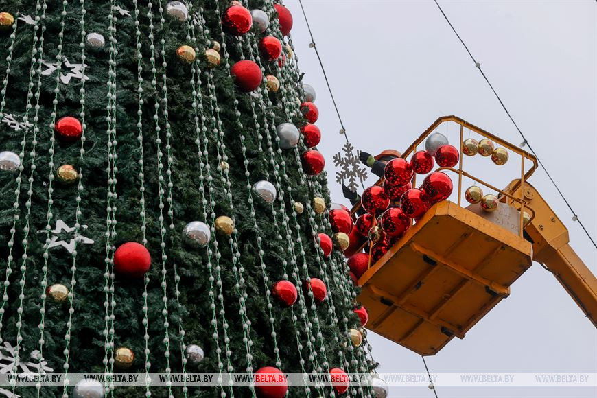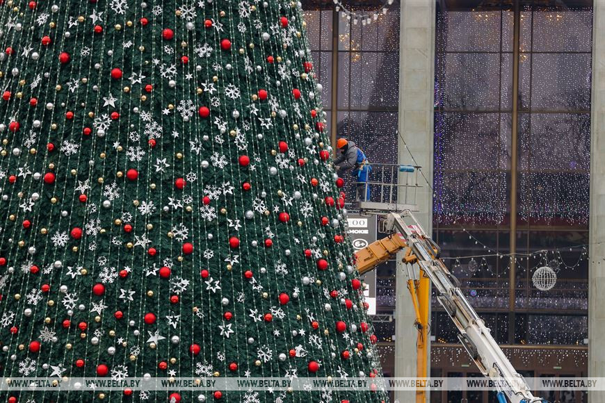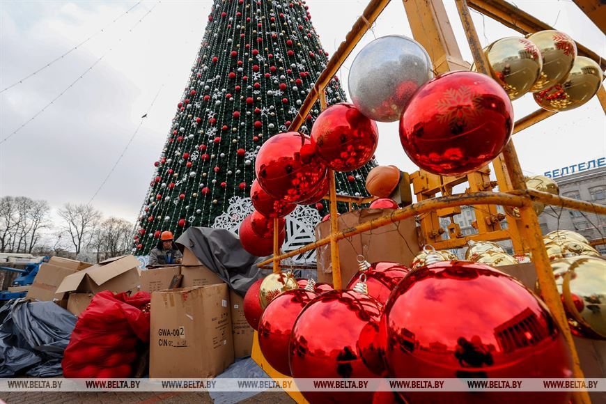 2 декабря, Минск /Корр. БЕЛТА/. Главную новогоднюю елку страны на Октябрьской площади Минска смонтировали еще на минувшей неделе. Сейчас ее украшают ярко-красными, серебристыми и золотистыми шарами. Всего их будет около 4 тыс. Скоро новогодняя красавица предстанет перед жителями и гостями столицы во всем великолепии.-0-