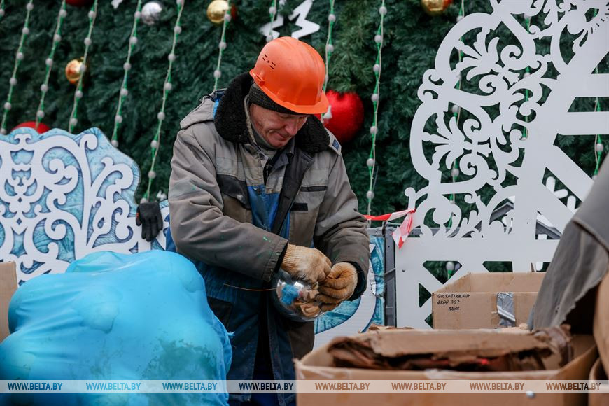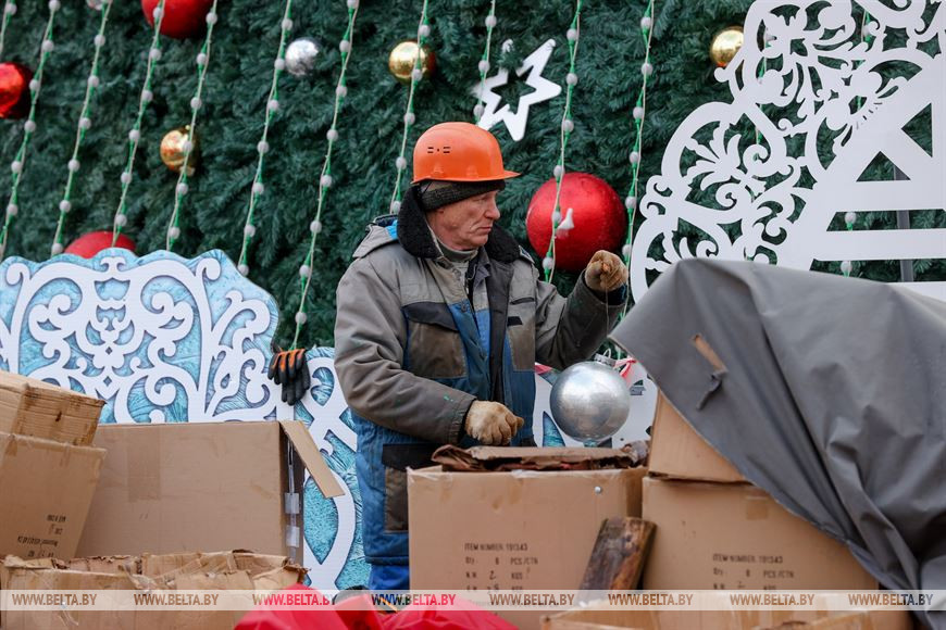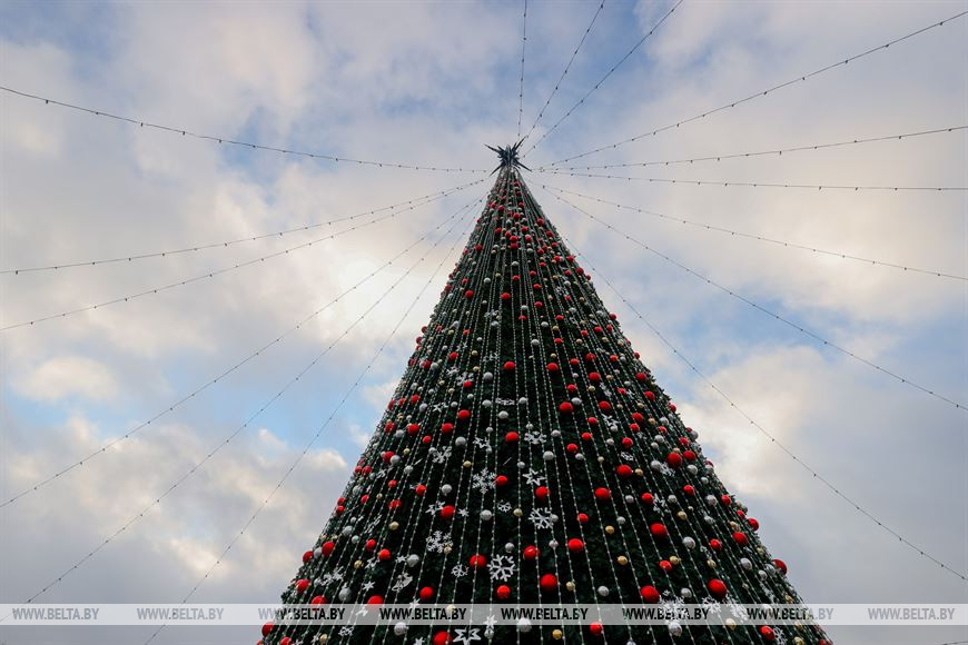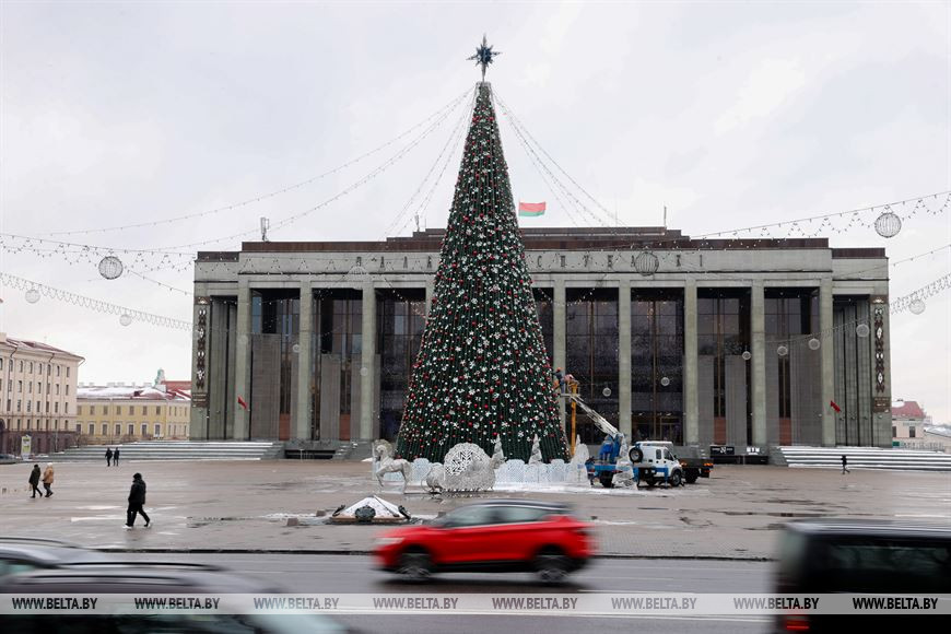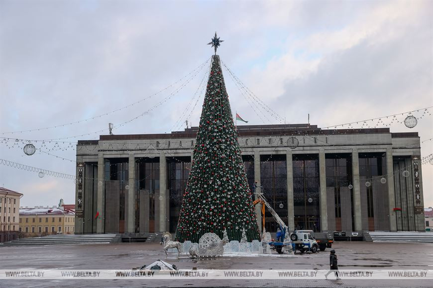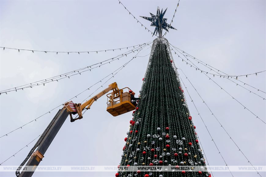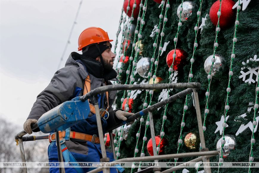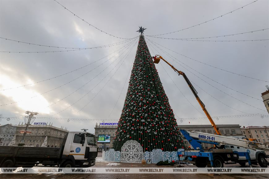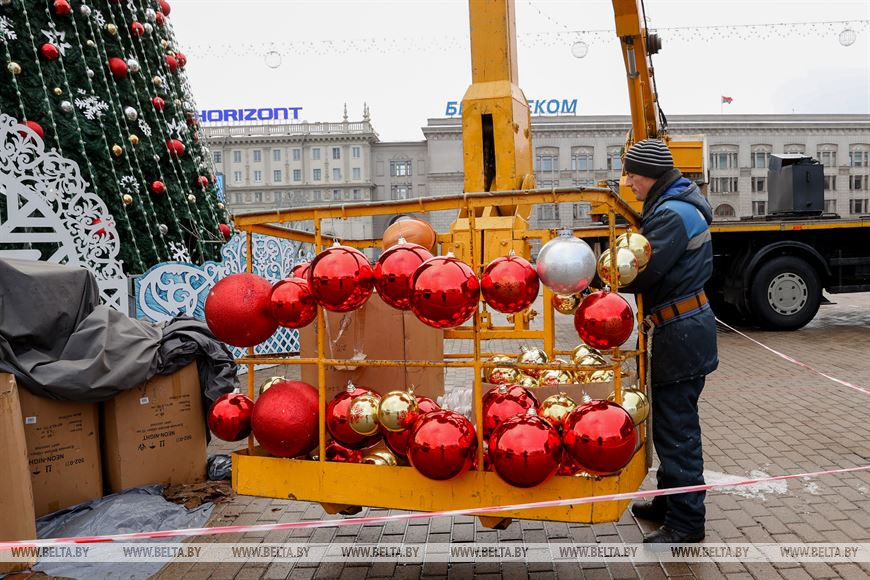 2 декабря, Минск /Корр. БЕЛТА/. Главную новогоднюю елку страны на Октябрьской площади Минска смонтировали еще на минувшей неделе. Сейчас ее украшают ярко-красными, серебристыми и золотистыми шарами. Всего их будет около 4 тыс. Скоро новогодняя красавица предстанет перед жителями и гостями столицы во всем великолепии.-0-