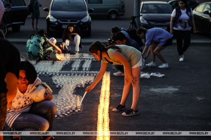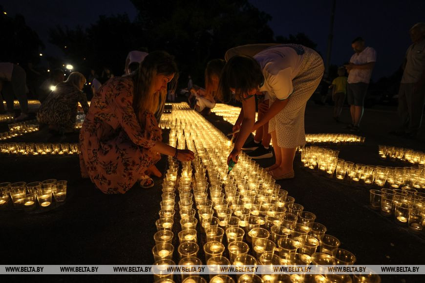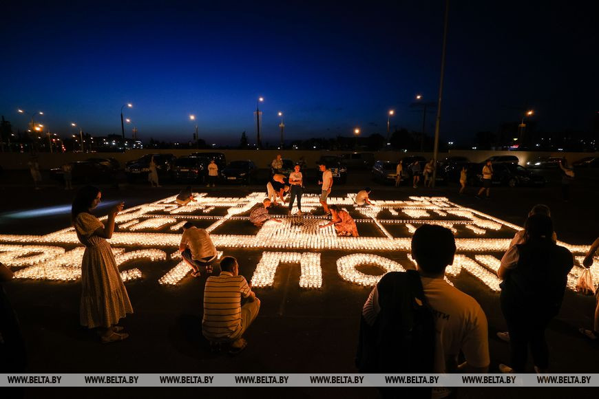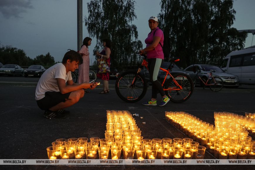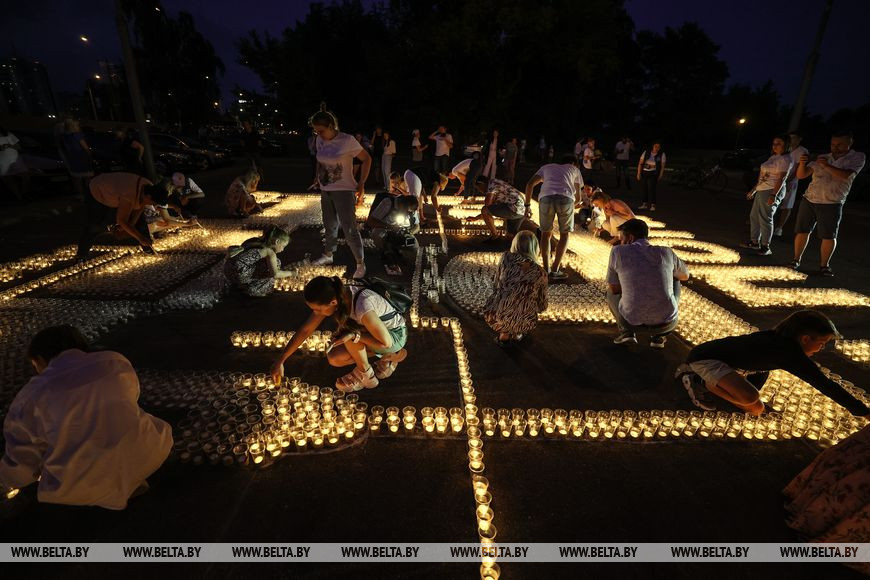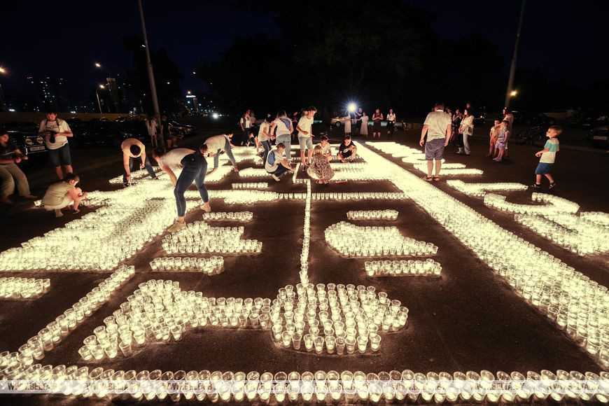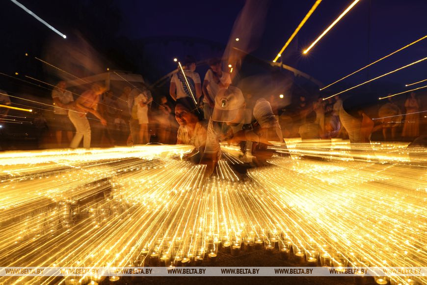 22 июня, Минск /Корр. БЕЛТА/. Огненную инсталляцию "Холмские ворота" создали 21 июня в Бресте возле Брестской крепости в рамках акции международного патриотического проекта "Огненные картины войны". Необычное полотно, олицетворяющее главный символ крепости, состоит из более чем 10 тыс. свечей и лампад, а размер составляет 10х12 метров и виден с высоты птичьего полета. В создании проекта приняли участие молодежь Беларуси и России.-0-