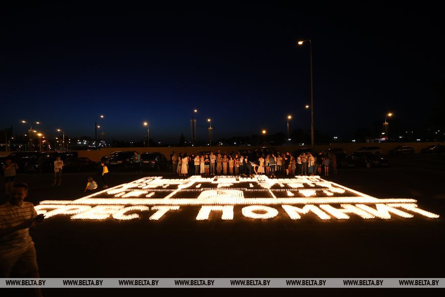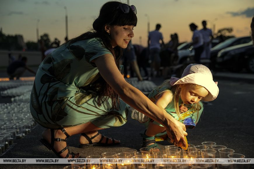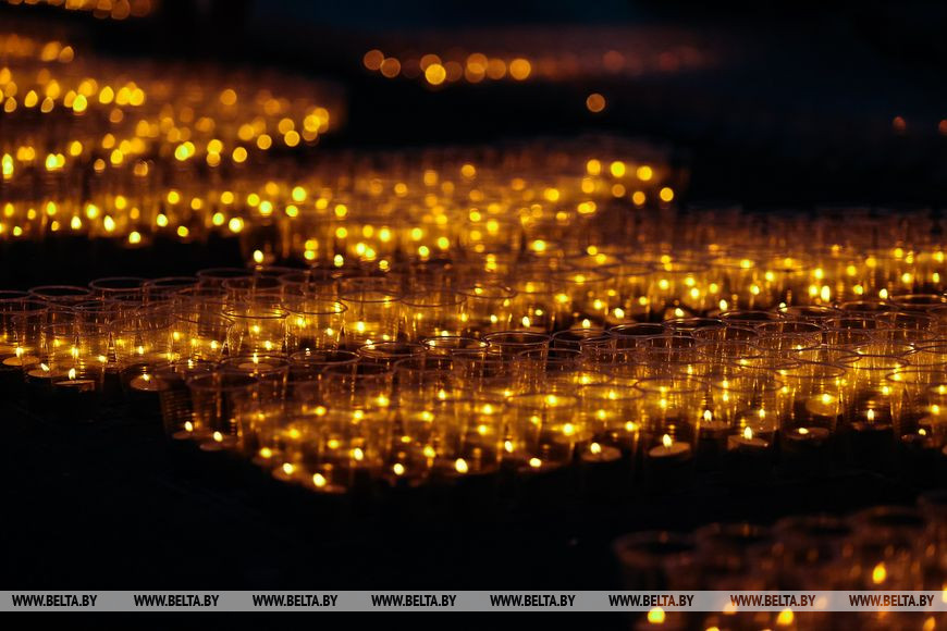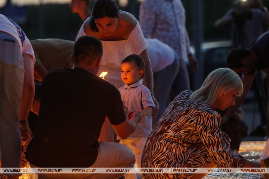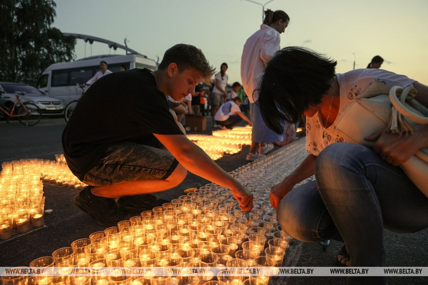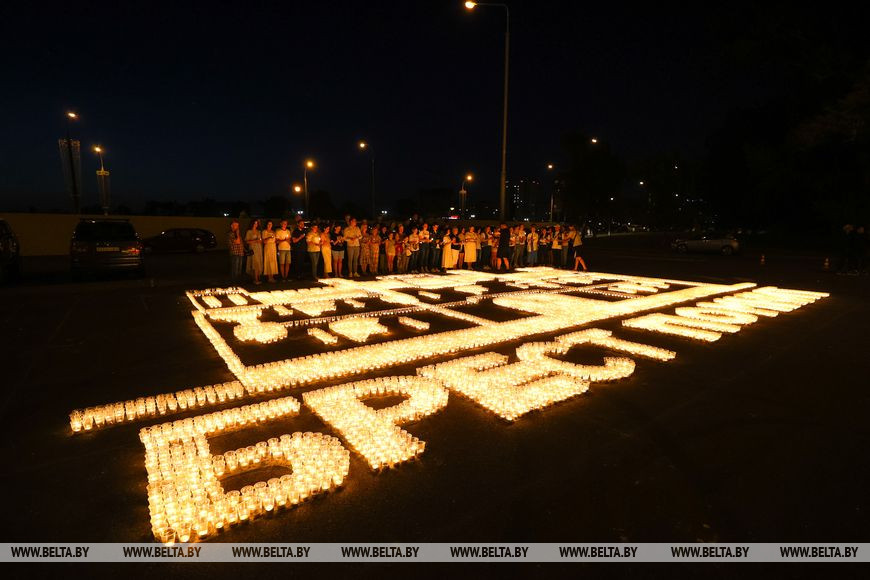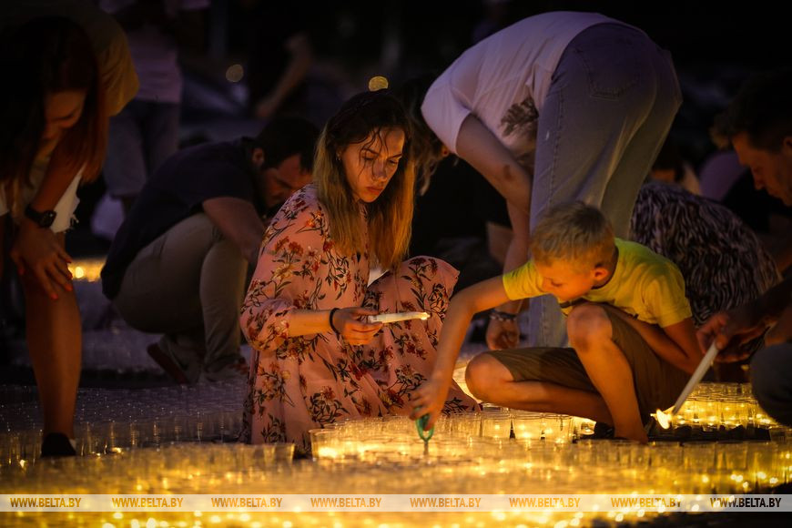 22 июня, Минск /Корр. БЕЛТА/. Огненную инсталляцию "Холмские ворота" создали 21 июня в Бресте возле Брестской крепости в рамках акции международного патриотического проекта "Огненные картины войны". Необычное полотно, олицетворяющее главный символ крепости, состоит из более чем 10 тыс. свечей и лампад, а размер составляет 10х12 метров и виден с высоты птичьего полета. В создании проекта приняли участие молодежь Беларуси и России.-0-