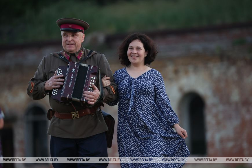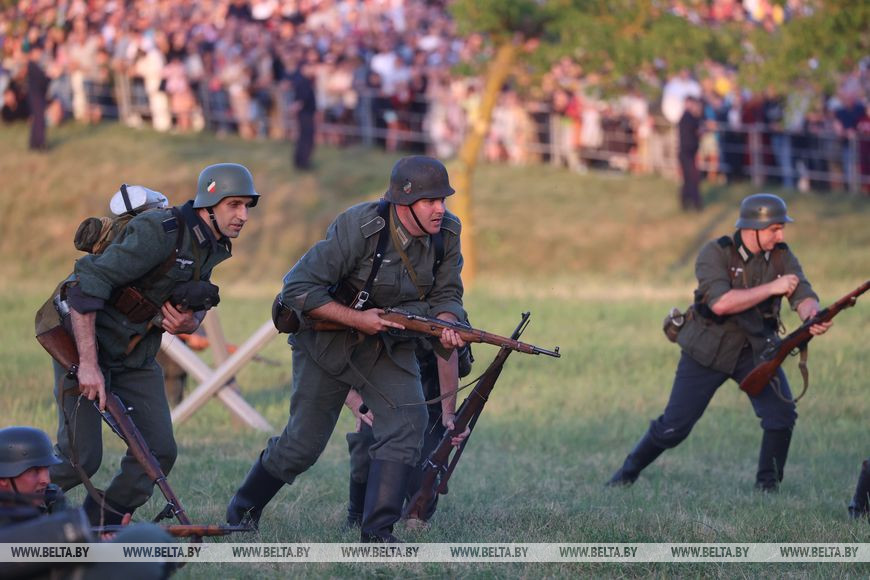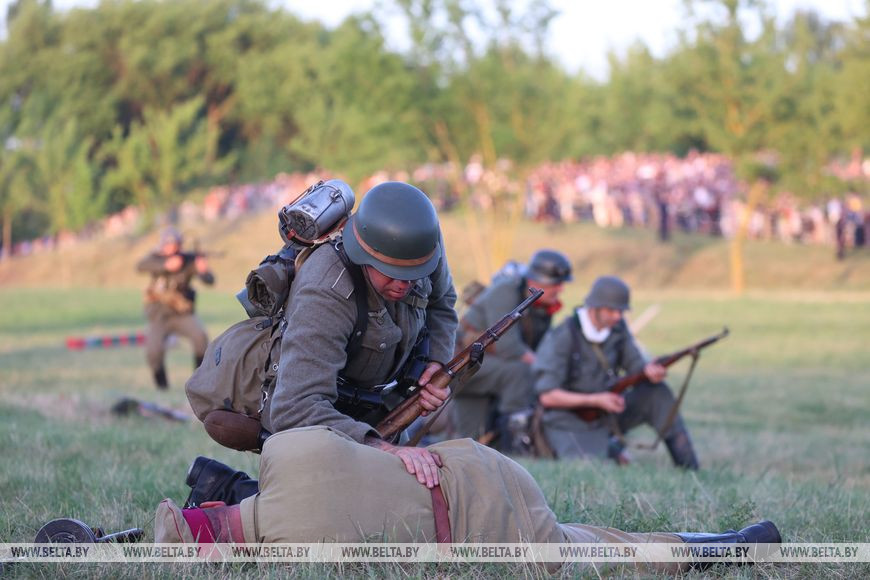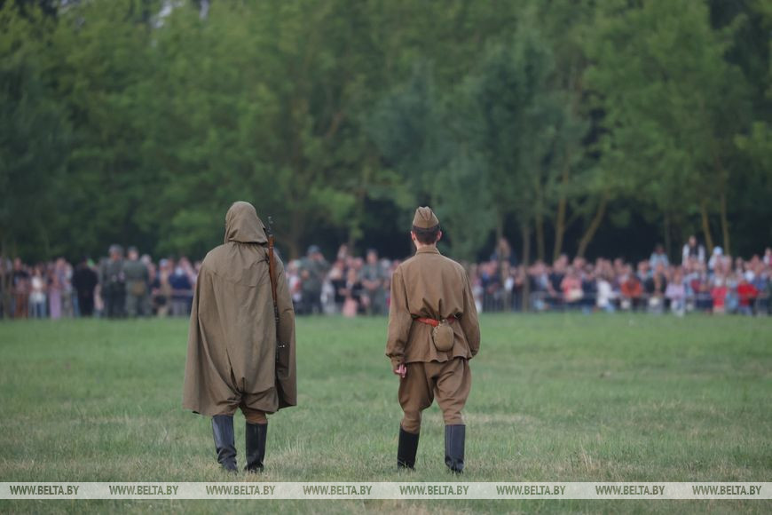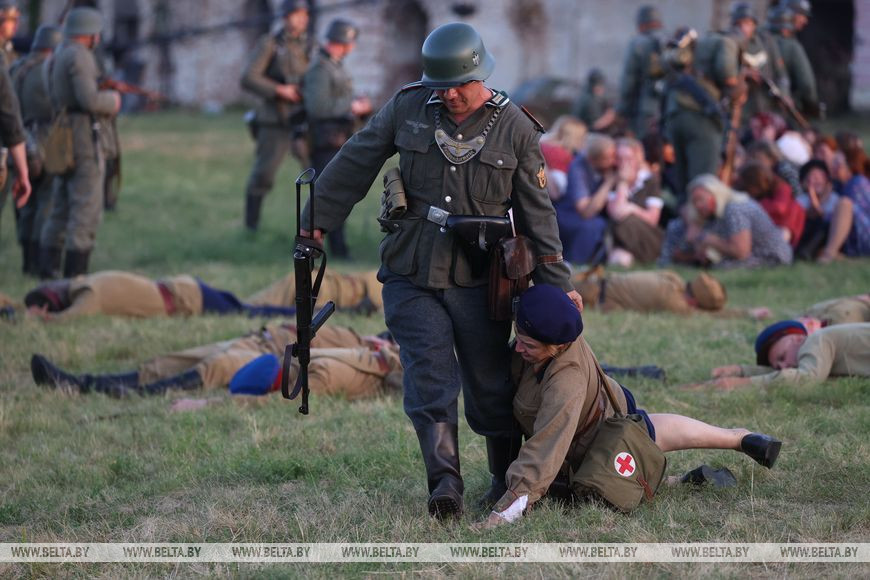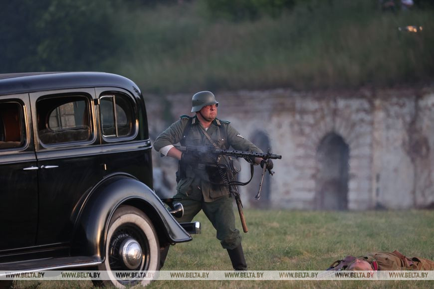 22 июня, Минск /Корр. БЕЛТА/. Военно-историческая реконструкция "22 июня. Брестская крепость", посвященная Дню всенародной памяти жертв Великой Отечественной войны и 80-летию героической обороны Брестской крепости, собрала в мемориальном комплексе тысячи зрителей. В юбилейном Х фестивале участвуют более 300 реконструкторов из Беларуси, России, Украины, стран Балтии. В постановке также задействована техника - танк, бронетранспортер, грузовики, мотоциклы. Что-то своим ходом пригнали сами энтузиасты. Тяжелую технику предоставил "Беларусьфильм", оружие и боеприпасы - Министерство обороны. -0-