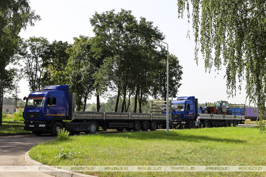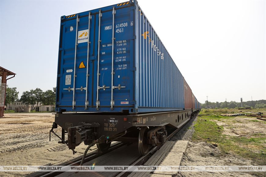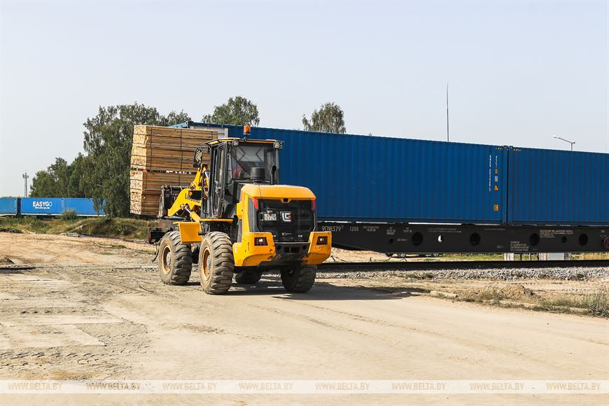 Первый контейнерный поезд состоит из 31 фитинговой двухместной платформы, на которой разместились 62 вагона. Состав загружен пиломатериалами деревообрабатывающих предприятий республики и будет двигаться по маршруту "Один пояс, один путь". На символический запуск логистического центра приехал председатель Жабинковского райисполкома Вадим Кравчук.