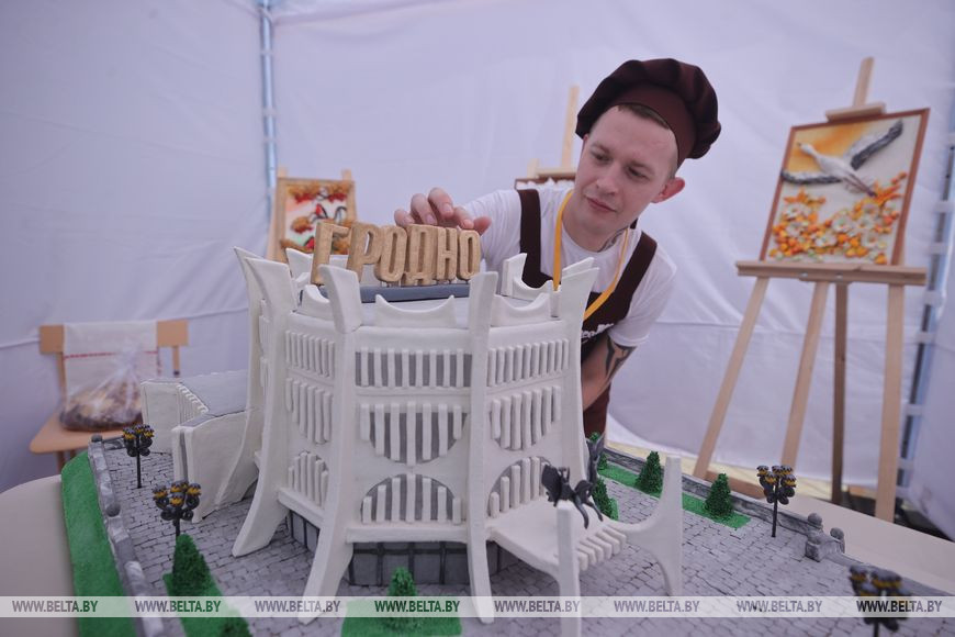 Пекари со всей страны представляют свои труды. Один из главных экспонатов на выставке хлебобулочных изделий - стокилограммовый каравай, который испекли гродненские мастера. "Готовили в несколько этапов, неделя на создание ушла. Все работники булочного цеха принимали участие. Сделан он из сдобного теста и очень вкусный", - рассказывает начальник булочного цеха ОАО "Гроднохлебпром" Светалана Потехина. Она добавила, что все украшения сделаны вручную. "Каравай символизирует нашу синеокую Беларусь. Мы хотели показать, что наша родина богата различными объектами историческими и красивой природой", - отметила Светлана Потехина.