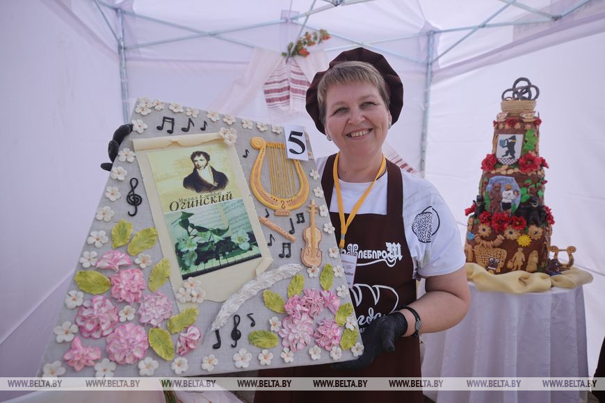 Обратились к историческому наследию и мастера из Сморгони. "Наша земля - родина знаменитого Михаила Клеофаса Огинского. Этим и вдохновилась. Панно создано из соленого теста, понадобилось недели две, все вручную лепила. Раскрашивалось гуашью. Я сразу после школы пошла работать на хлебозавод и работаю здесь уже 28 лет. Вся выпечка на мне, но это вместе с тем и мое хобби: люблю печь булочки, торты. А сегодня помогу каждому, кто захочет научиться сделать что-то подобное", - рассказала кочегар производственных печей Сморгонского хлебозавода ОАО "Гроднохлебпром" Валентина Пашкевич.