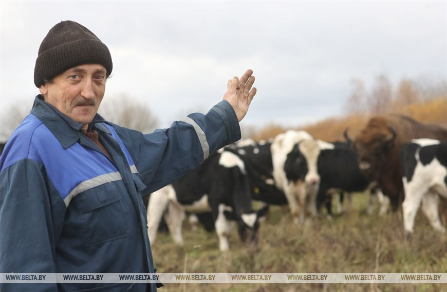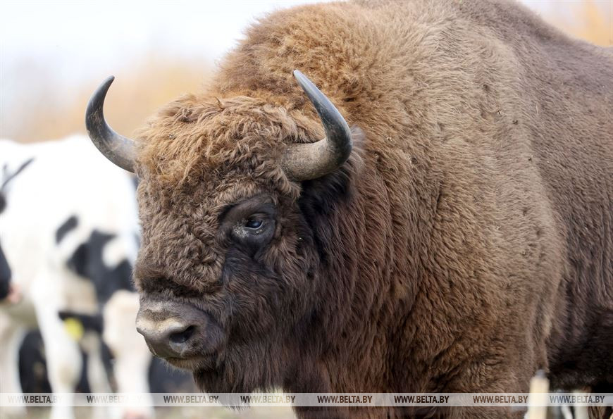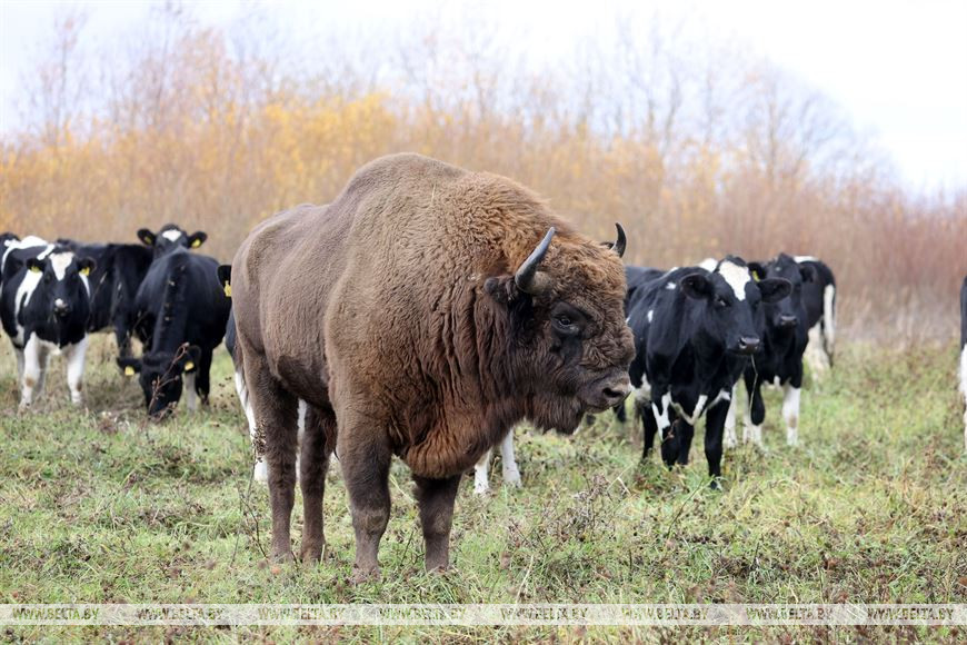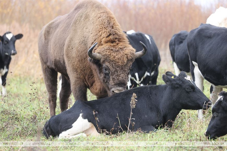27 октября, Глубокский район /Корр. БЕЛТА/. Необычный сосед появился у стада телят в Глубокском районе, уже третью неделю вместе с ними пасется зубр, сообщает корреспондент БЕЛТА.