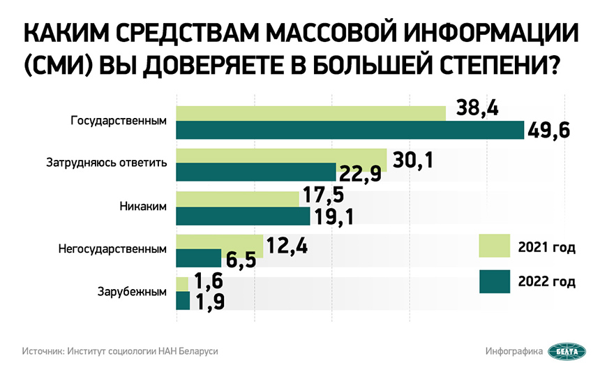 Вместе с тем позиции негосударственных СМИ падают - с 12,4% в 2021 году до 6,5% в 2022-м. Практически не изменилось число тех, кто не доверяет никаким СМИ (17,5% - в 2021 году и 19,1% в 2022 году). А вот затруднившихся ответить стало меньше на 7,2%. -0-