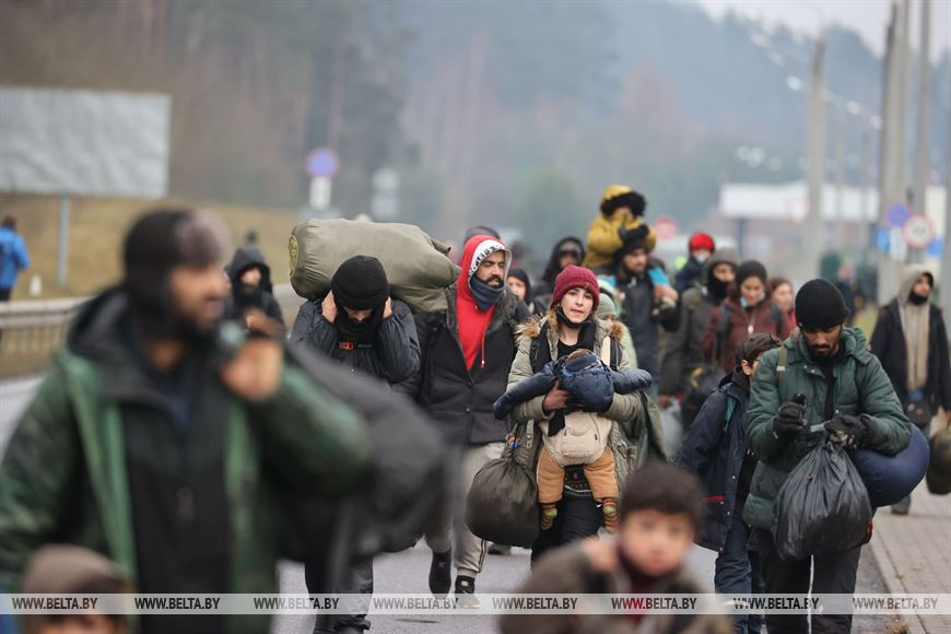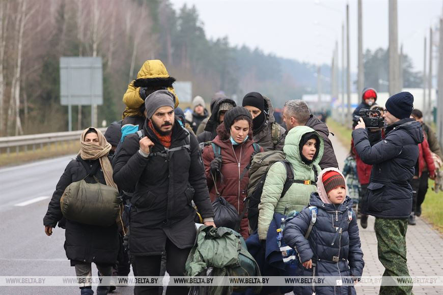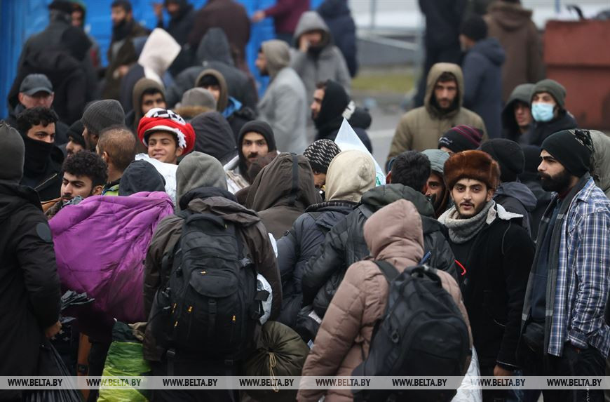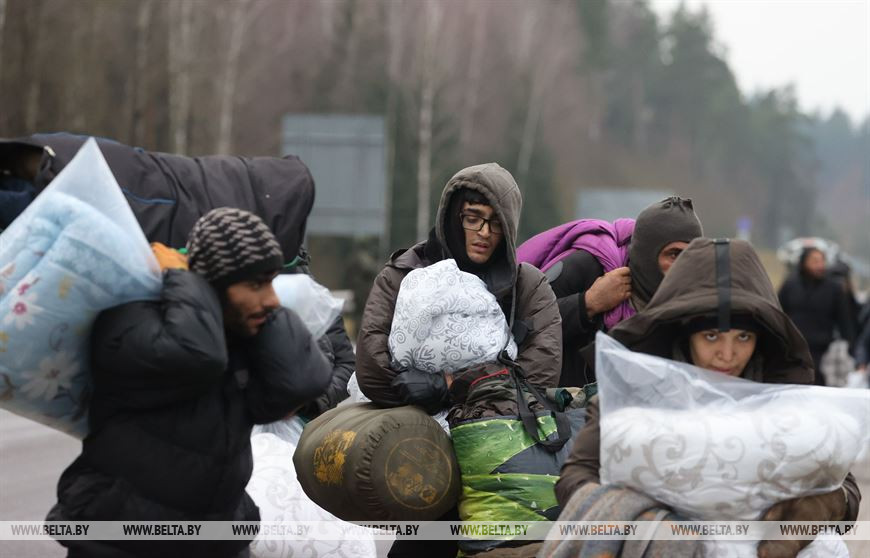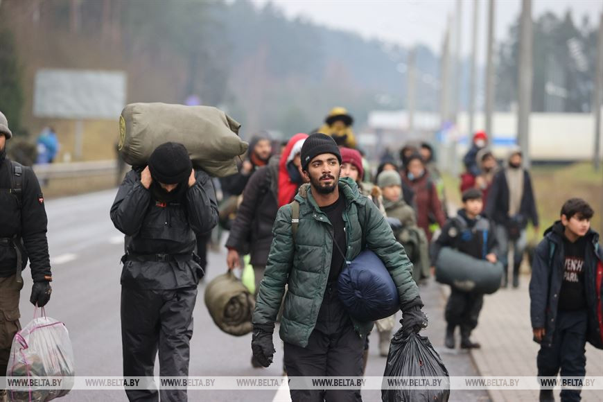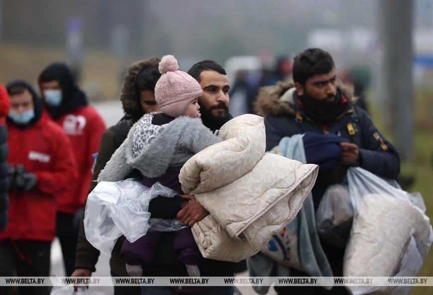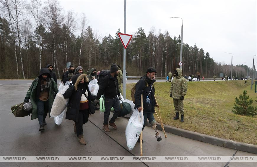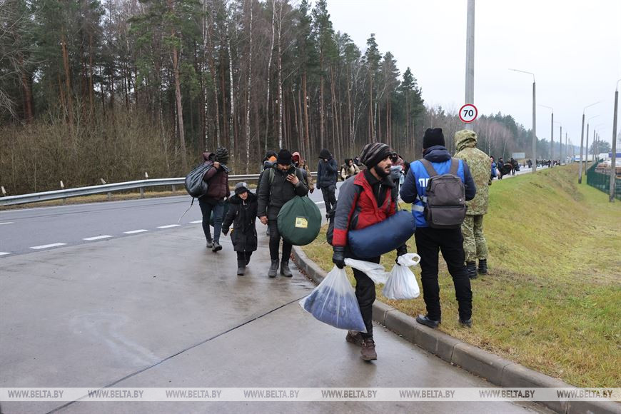 18 ноября, Гродненская область /Корр. БЕЛТА/. Беженцев, которые находились в лагере возле пропускного пункта на белорусско-польской границе, разделили на небольшие группы, началось их перемещение в транспортно-логистический центр.