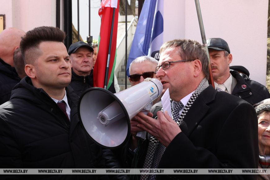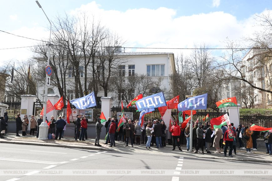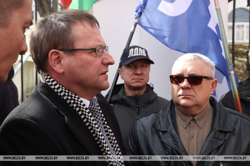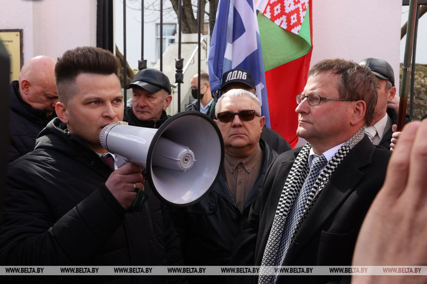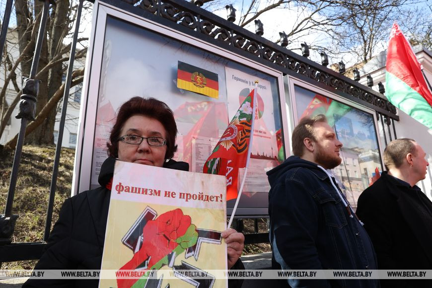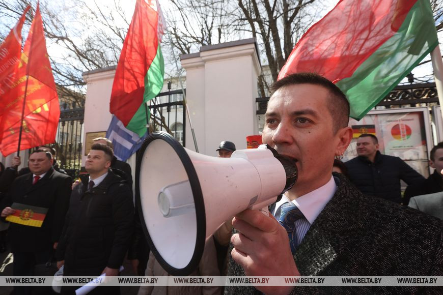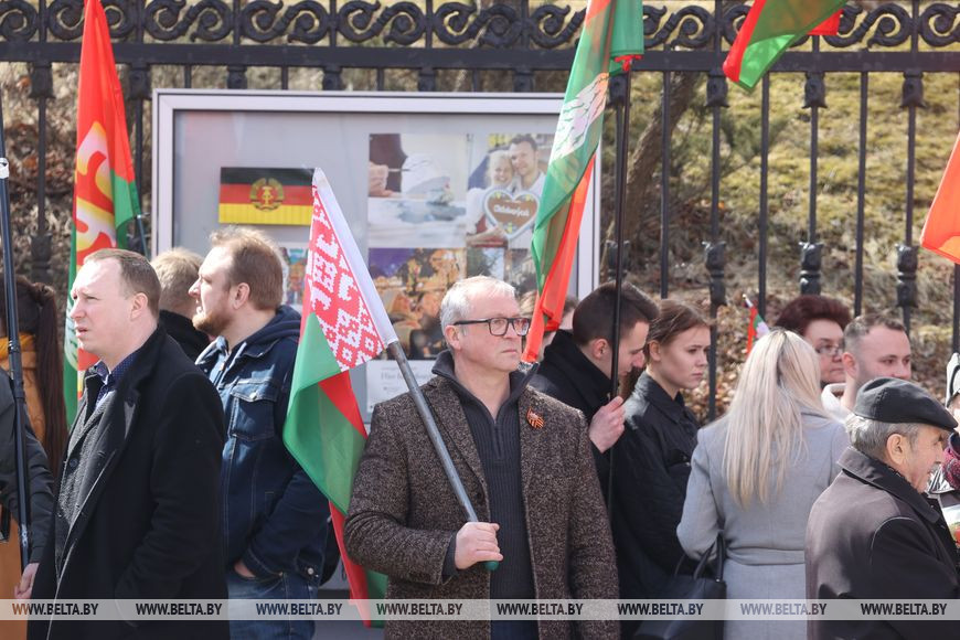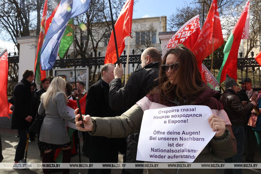 12 апреля, Минск /Корр. БЕЛТА/. Неравнодушные белорусы возле посольства Германии в Минске выступают против надругательства над государственным флагом страны. Государственный флаг Республики Беларусь, установленный на территории мемориального комплекса на месте концлагеря, был снят с флагштока в Бухенвальде во время памятной акции.-0-
