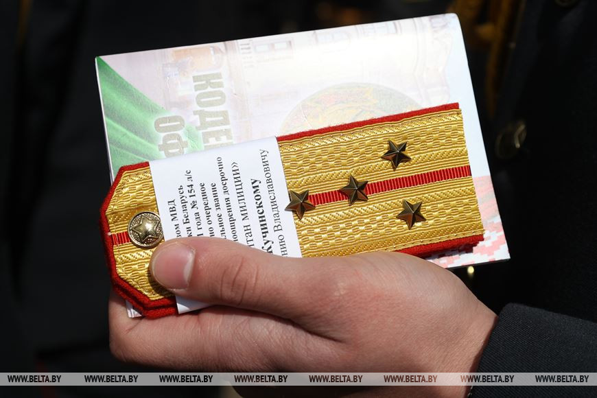 Во время митинга-реквиема состоялось досрочное вручение 14 офицерам капитанских погон. "В торжественной обстановке мы вручали 14 сотрудникам органов внутренних дел, старшим лейтенантам, но уже капитанам, звания досрочно. Это те люди, которые своим примером показывают достойное несение службы, не считаясь с личным временем", - отметил министр МВД.