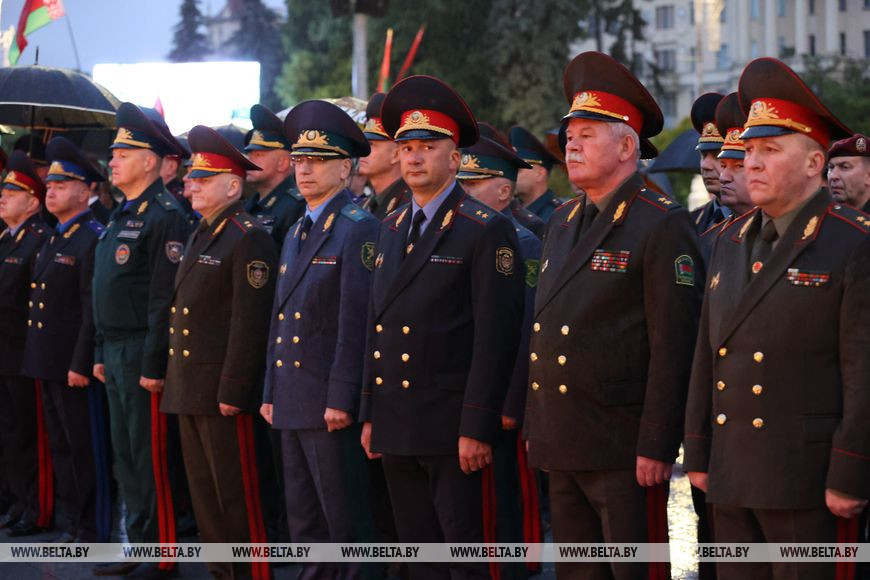 В 19.00 у скульптурной композиции "Героям границы, женщинам и детям, мужеством своим в бессмертие шагнувшим" выстроились 50 курсантов Института пограничной службы с портретами погибших героев-пограничников. В скорбном молчании курсанты, военнослужащие Брестской пограничной группы, учащиеся военно-патриотических классов пограничной направленности, жители Бреста, гости города почтили память павших героев. Участники мероприятия возложили цветы к скульптурной композиции.