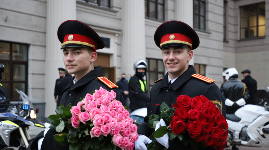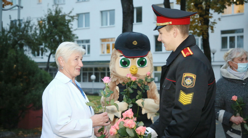 Представительниц ведомственных республиканского госпиталя, центральной поликлиники и Министерства внутренних дел у входа встречали с цветами и музыкой. Заслуженный коллектив духового оркестра ГУВД Минска расположился у поликлиники еще до рассвета - первых медработников встретил бодрящий саундтрек из советской комедии. А курсанты Специализированного лицея МВД - некоторые из них в костюмах ростовых кукол - всем сотрудницам дарили розы.