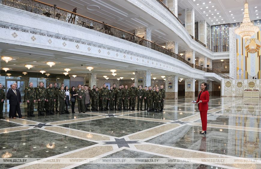 Экскурсию для них провела пресс-секретарь Президента Беларуси Наталья Эйсмонт. Она же от имени белорусского лидера еще раз поздравила военных с праздником, подчеркнув, что в последние годы люди еще более осознанно начали относиться к таким понятиям, как мир и безопасность. "Сегодняшний праздник приобрел особый статус и особую значимость. Именно поэтому Президентом было поручено 23 февраля во Дворец Независимости - главную официальную и торжественную площадку нашей страны, то место, которое по-настоящему олицетворяет наш суверенитет, независимость, - пригласить тех, кто должен быть сегодня здесь", - сказала она.