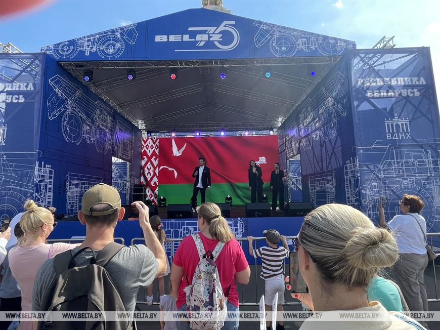 Восьмичасовой музыкальный марафон, посвященный юбилею БЕЛАЗа, начался ровно в полдень на ВДНХ, на площади у самого известного московского фонтана "Дружба народов". Его участниками стали залуженные артисты Беларуси Руслан Алехно, Александр Солодуха Виктория Алешко, виртуоз-балалаечник Александр Воронище, арт-группа "Беларусы", фолк-шоу "Забабоны" и многие другие артисты.