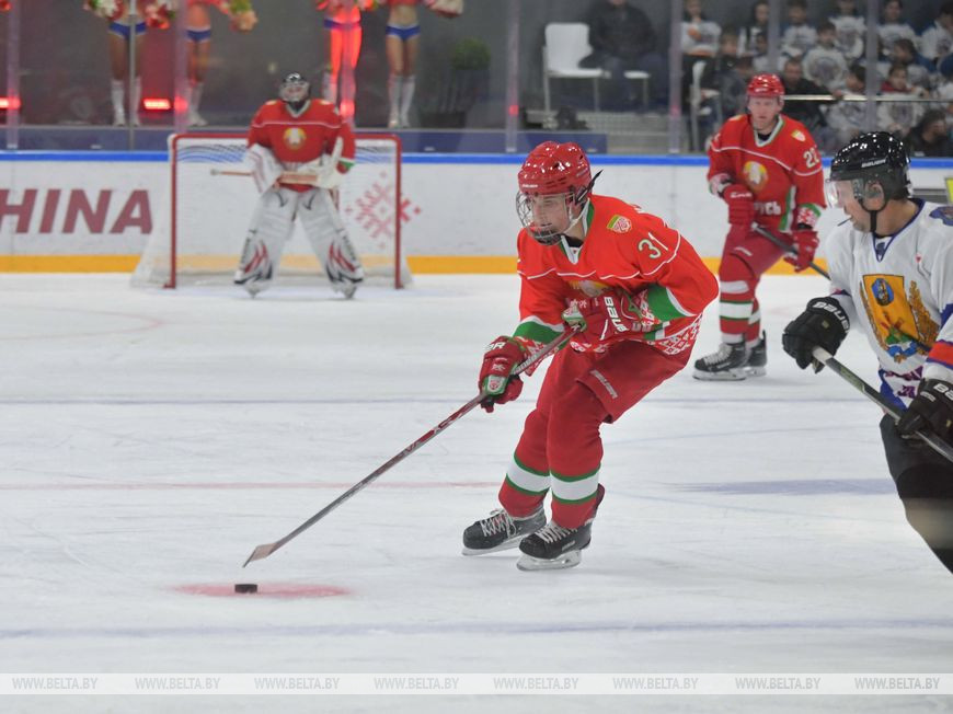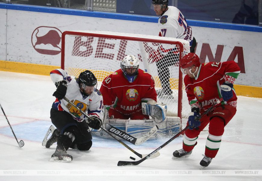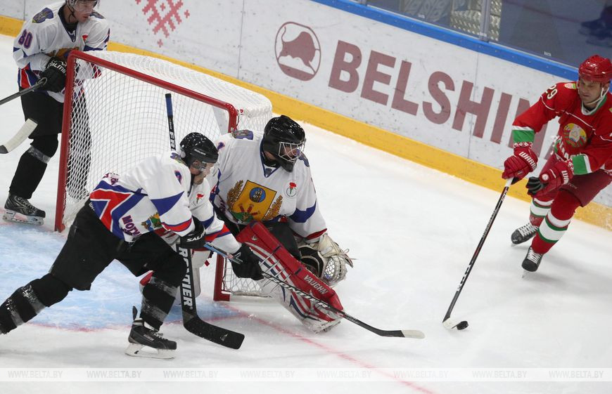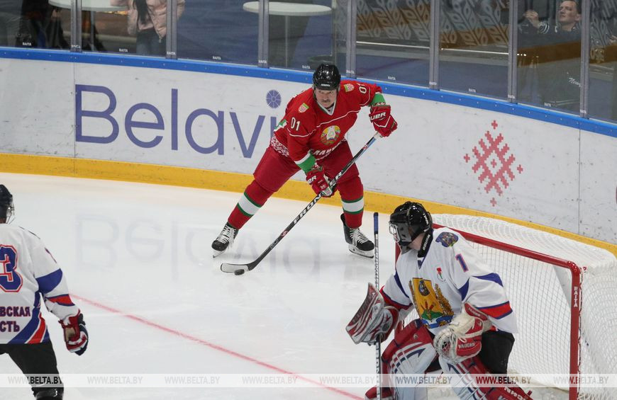 Встреча на ледовой площадке столичного "Олимпик парка" прошла под диктовку президентской дружины. С первых минут они завладели инициативой, поведя планомерную осаду ворот соперников. Вратарю команды Могилевской области Денису Поварову пришлось не раз вступать в игру, чтобы не допустить взятия ворот. Но на 9-й минуте шайба все-таки достигла цели. Автором гола стал Андрей Башко, забросивший с передач Александра Лукашенко и Михаила Грабовского.